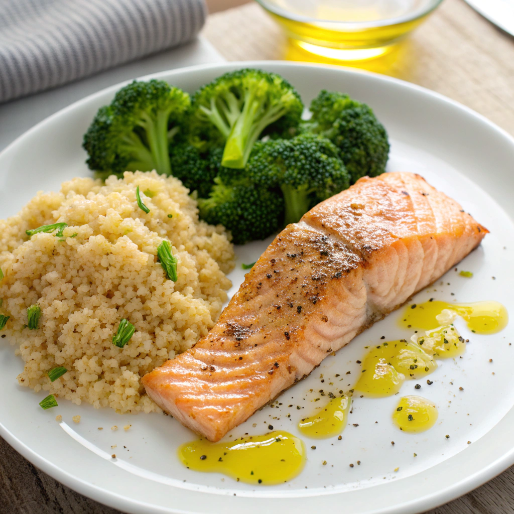 - Almoço: filé de salmão grelhado + brócolis cozido no vapor + arroz integral.