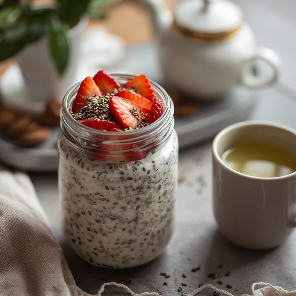 - Overnight oats com frutas vermelhas: aveia em flocos, iogurte natural, chia e frutas.